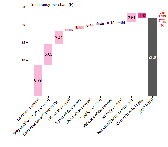 Our SOTP/NAV is replacement-cost-based on a geographical basis and product basis. We have used multiples of €170 per ton of cement capacity for grey cement in developed markets (Denmark and Belgium), a low multiple of €100 per ton of cement capacity for Turkey’s grey cement plants due to the difficult business environment in which the division is evolving.