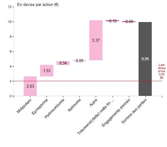 Les évaluations basées sur les pairs sont actuellement sans pertinence pour Crossject en raison de son absence de revenus et de ses résultats financiers négatifs. Notre évaluation basée sur la valeur nette des actifs (NAV) applique un multiple de 3x aux revenus projetés de 2025-27 dans tous les segments. Bien que ces revenus ne seront pas réalisés avant au moins trois ans, en particulier ceux de l’exercice 27, nous avons choisi de ne pas les actualiser. Cette décision est basée sur l’anticipation de taux de croissance élevés après 2025, indiquant que nos projections sont conservatrices. Le multiple de 3x est standard pour les entreprises de biotechnologie et pharmaceutiques ayant des pipelines de R&D substantiels et de fortes perspectives de croissance. En revanche, les valeurs de transaction dans le secteur varient souvent de 5x à 10x les ventes, selon le segment spécifique. Par exemple, Emergent Biosolutions a annoncé l’acquisition d’Adapt Pharma, le développeur de Narcan, pour 635 millions de dollars US plus 100 millions de dollars US en jalons de ventes. À l’époque, nous estimions les ventes d’Adapt Pharma à environ 150 millions de dollars US, ce qui implique un multiple de ventes d’environ 4,9x.